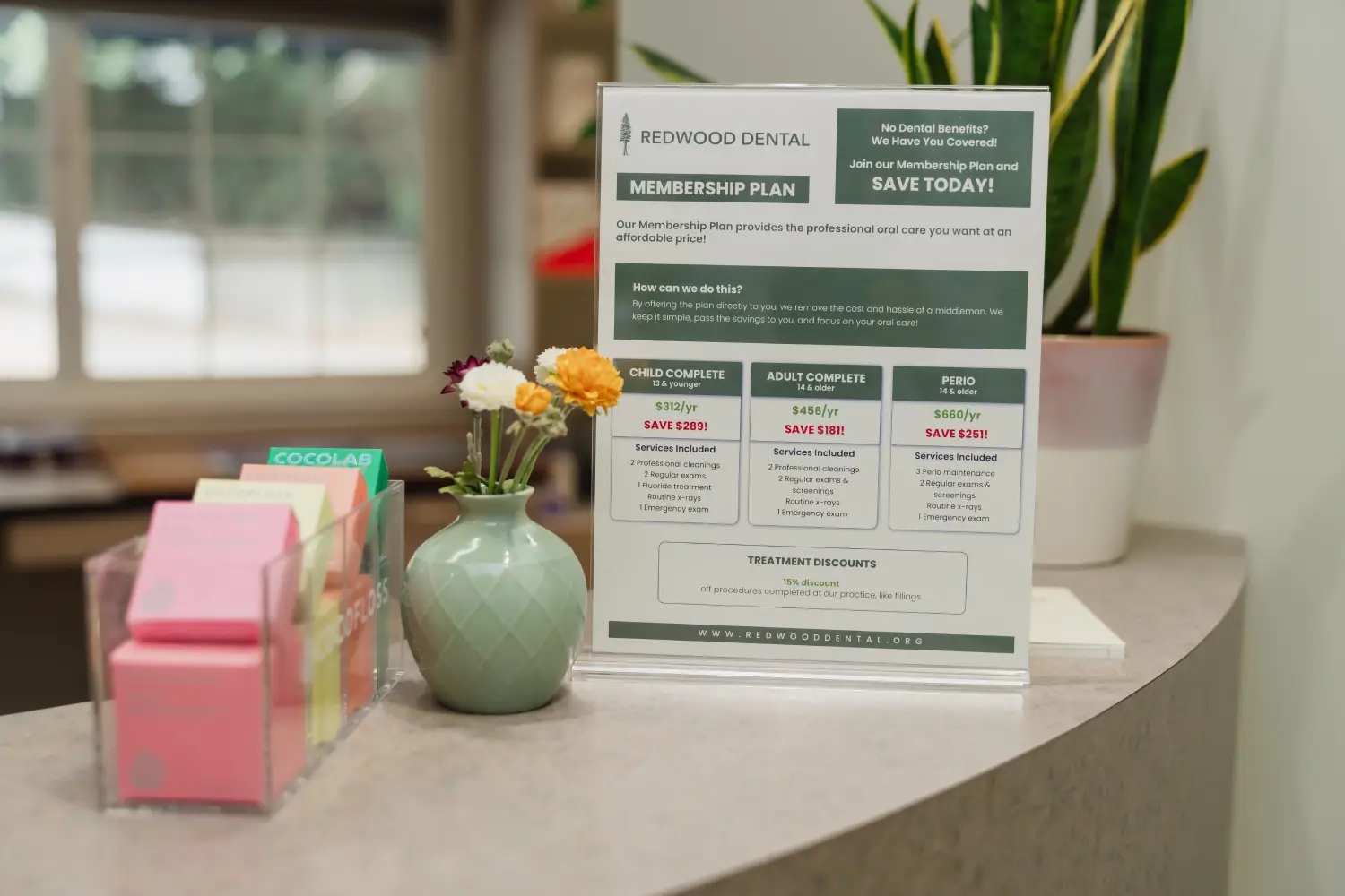 We decided to change that. At Redwood Dental, our Membership Plan removes the middleman so you can get the care you need without the stress. You’ll get your exams, cleanings, X-rays, emergency visits, and 15% off additional treatment for one simple, affordable price.